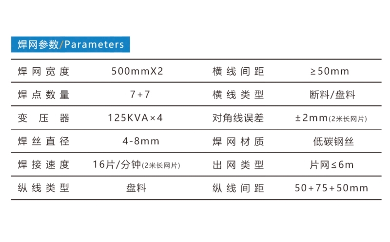 ALC是蒸壓加氣混凝土(Autoclaved lightweight Concrete)的簡稱,它是以石英砂或粉煤灰、水泥、石灰等為主原料,內(nèi)配雙層雙向冷拔絲鋼筋網(wǎng)片,經(jīng)過高溫蒸汽養(yǎng)護(hù)而成的多氣孔混凝土成型板材;既可做墻體材料,又可做屋面板、樓層板、外墻造型,是一種性能優(yōu)越、安裝簡便、靈活的成熟建材。雙片加氣板網(wǎng)片焊接生產(chǎn)線,可以高效率地自動焊接ALC所需的鋼筋網(wǎng)片。焊點(diǎn)數(shù)量7+7個,焊網(wǎng)寬度500mm×2,焊接絲徑4-8mm,每分鐘約焊接16片。標(biāo)準(zhǔn)配置:放線盤、縱線盤絲入料模塊、伺服送網(wǎng)、橫線雙片料斗、焊接主機(jī)、剪網(wǎng)機(jī)、簸箕式落網(wǎng)。可選配置:橫線盤料、出網(wǎng)小車、簡易循環(huán)冷卻器、空壓機(jī)。河北驕陽焊工有限公司,0318-7063097