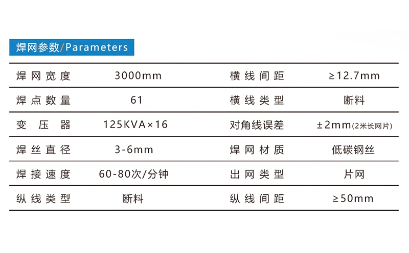 防爬網(wǎng)焊接生產(chǎn)線,焊接網(wǎng)寬度3000mm,焊接絲徑3-6mm,焊接速度為60-80次/分鐘,縱線橫線均為斷料。標(biāo)準(zhǔn)配置:縱線托絲平臺(tái)、橫線增料料斗、焊接主機(jī)、伺服拉網(wǎng)。可選配置:自動(dòng)折彎、縱線自動(dòng)布料+自動(dòng)送料、自動(dòng)抓取堆垛、堆垛小車、出網(wǎng)平臺(tái)、空壓機(jī)、中頻焊接系統(tǒng)。河北驕陽焊工有限公司,0318-7063097