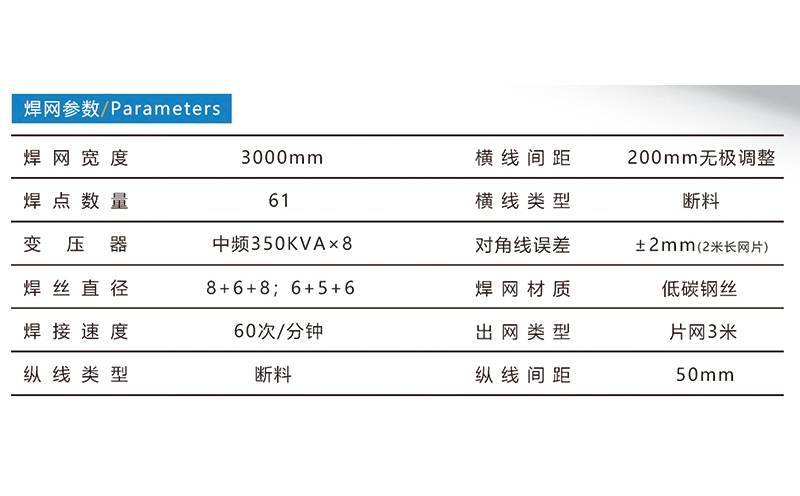 雙絲圍欄網(wǎng)焊接生產(chǎn)線,焊接網(wǎng)寬度3000mm,焊接絲徑8+6+8mm/6+5+6mm,焊接速度為60次/分鐘,縱線橫線均為斷料。標準配置:縱線托絲平臺、橫線增料料斗、焊接主機、伺服拉網(wǎng)??蛇x配置:自動折彎、縱線自動布料+自動送料、自動抓取堆垛、堆垛小車、出網(wǎng)平臺、空壓機、中頻焊接系統(tǒng)。河北驕陽焊工有限公司,0318-7063097
