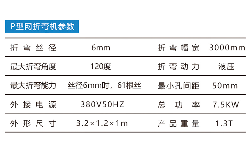 P型網折彎機,折彎絲徑6mm,折彎幅寬3米,最大折彎角度120度,最大折彎能力61根絲(絲徑6mm時)。