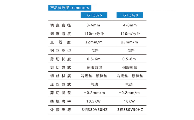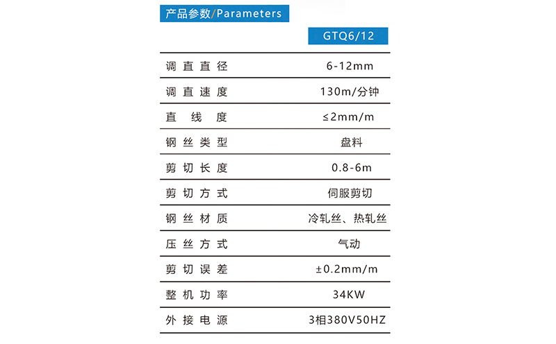 調(diào)直切斷機(jī)GTQ6/12,調(diào)直直徑6-12mm,調(diào)直速度130米/分鐘,伺服剪切,剪切長度0.8-6米。可選配置:動力放線盤、鎢鋼叼絲輪、鎢鋼直絲模、潤滑裝置。河北驕陽焊工有限公司,0318-7063097